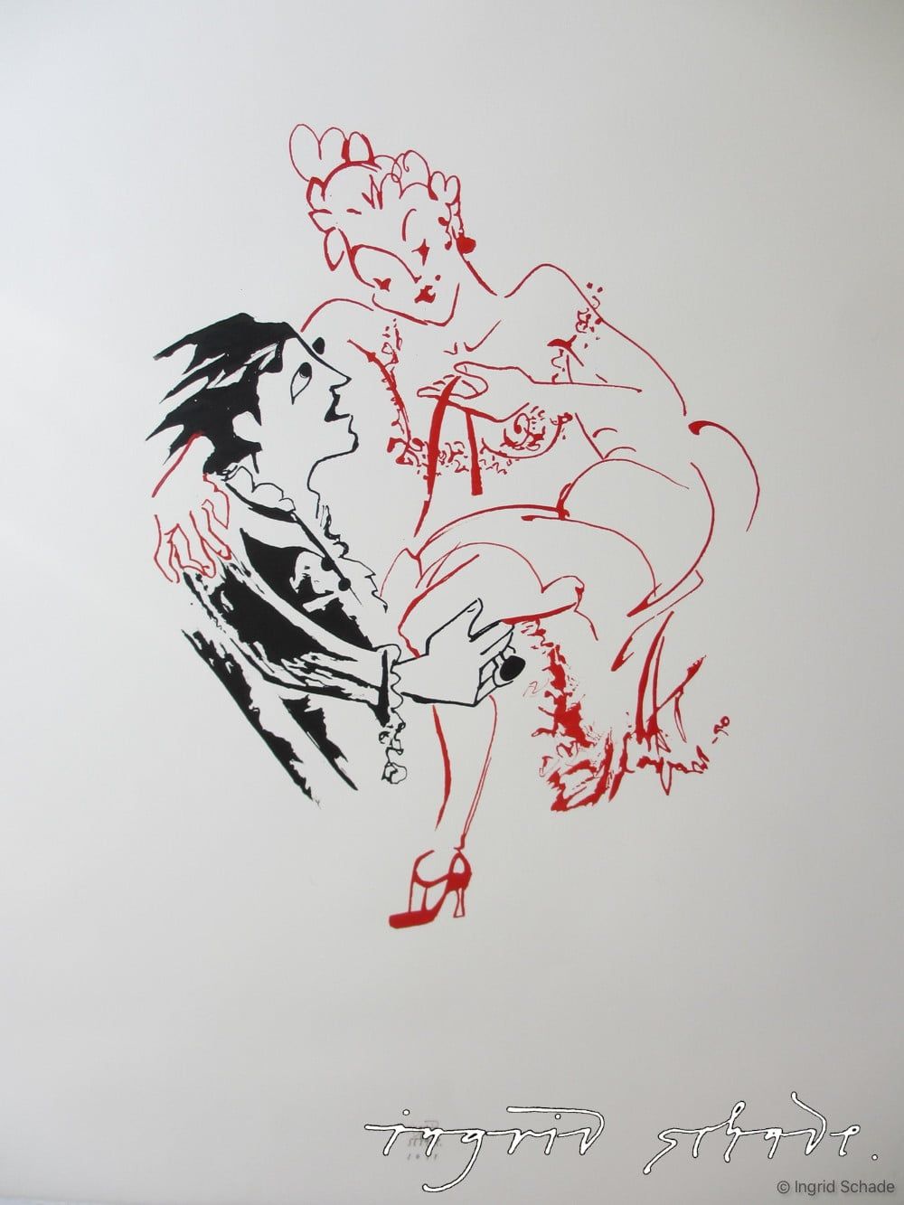 Der Schriftentwurf für den laufenden Text ist eine eigene Form einer Rokoko-Handschrift. Schwarze und rote Aquarellfarbe für den Text, schwarze und rote Aacrylfarbe für die Zeichnungen, ausgeführt mit schmaler und breiter Flachfeder auf RIVES-Bütten.
