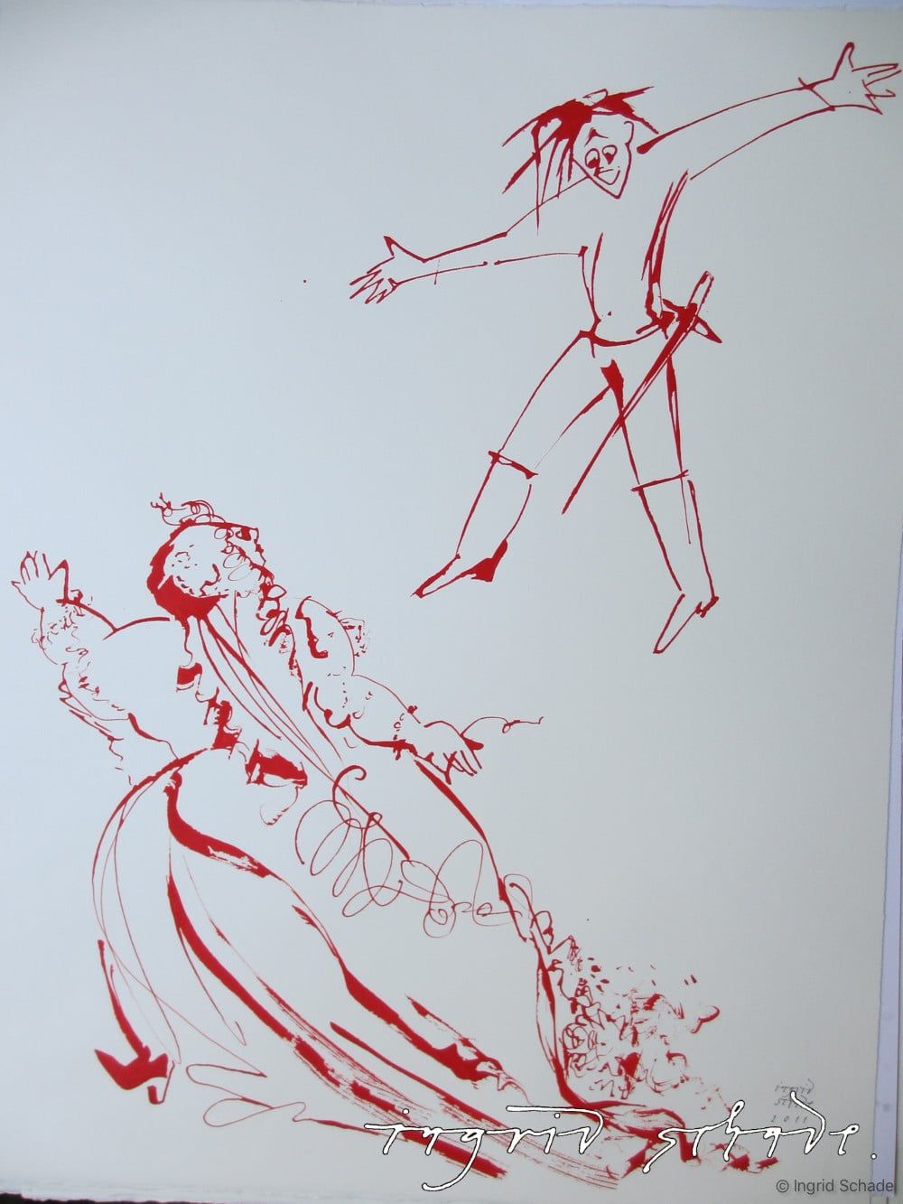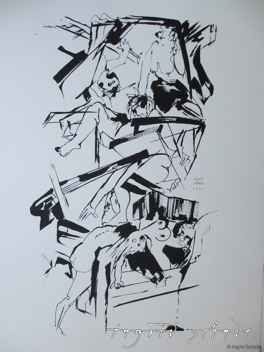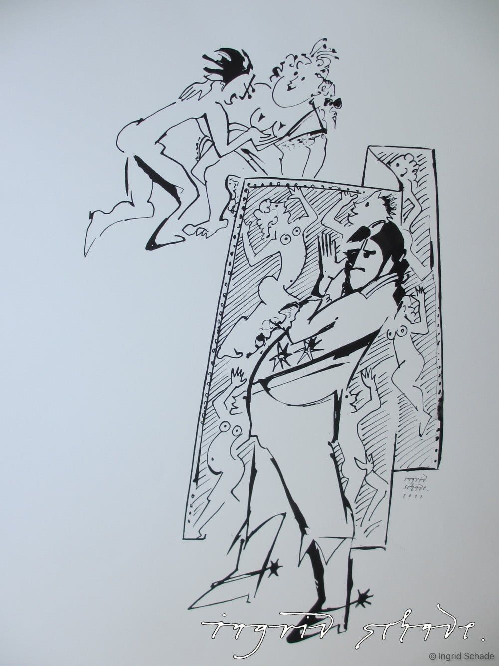 Auswahl aus 31 Zeichnungen zu meinem vollständig kalligraphierten und reich illustrierten Buch-Unikat  „Candid“ von Voltaire