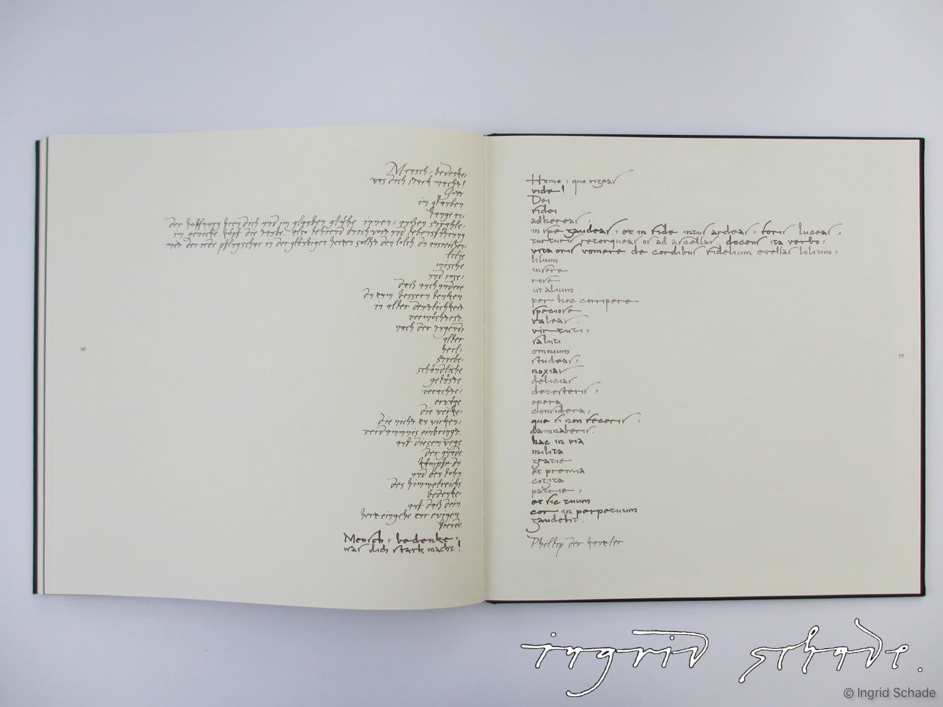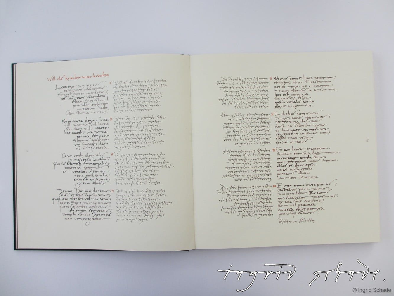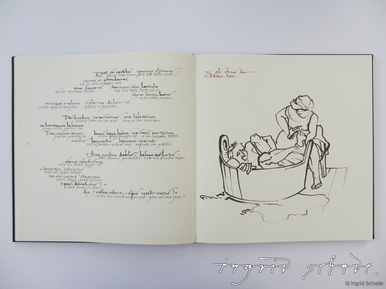 Gestaltung einer Karolingischen Minuskel als Handschrift für die lateinischen Texte und Entwicklung einer eigenen Kursiv-Handschrift auf der Basis einer frühen römischen Handschrift für die deutschen Übersetzungen (Schade-Kursiv), Minuskel mit Rohrfeder und Aquarellfarbe, Kursive mit Spitzfeder und schwarzer Tinte geschrieben. Alle Zeichnungen wurden ebenfalls mit Rohrfeder und Aquarellfarbe ausgeführt.